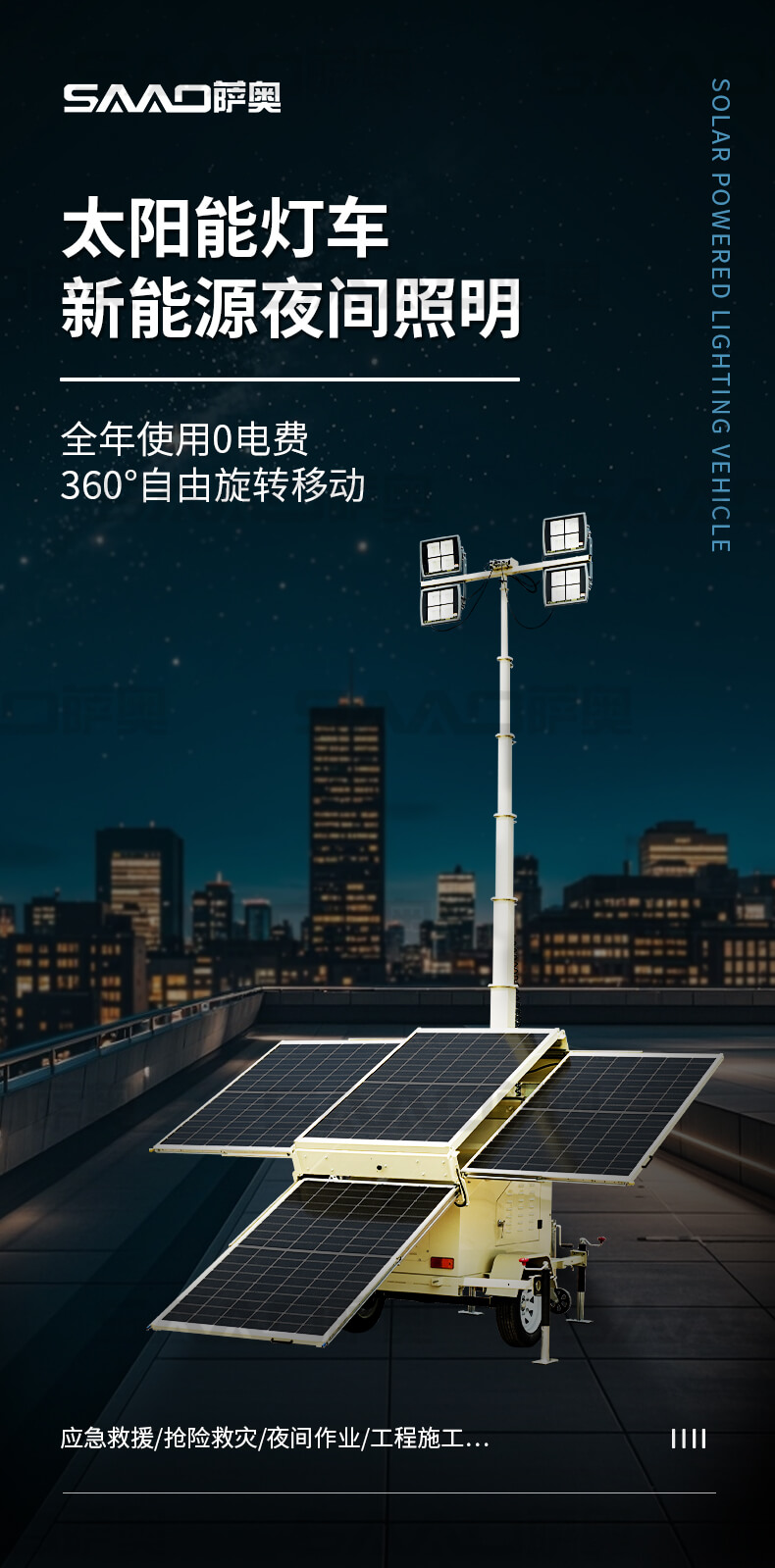 太阳能移动照明灯车适用于铁路、电力、公安、消防、露天采矿等各种大型施工作业、事故抢修、抢险救灾等工作现场对大面积高亮度照明的需要。