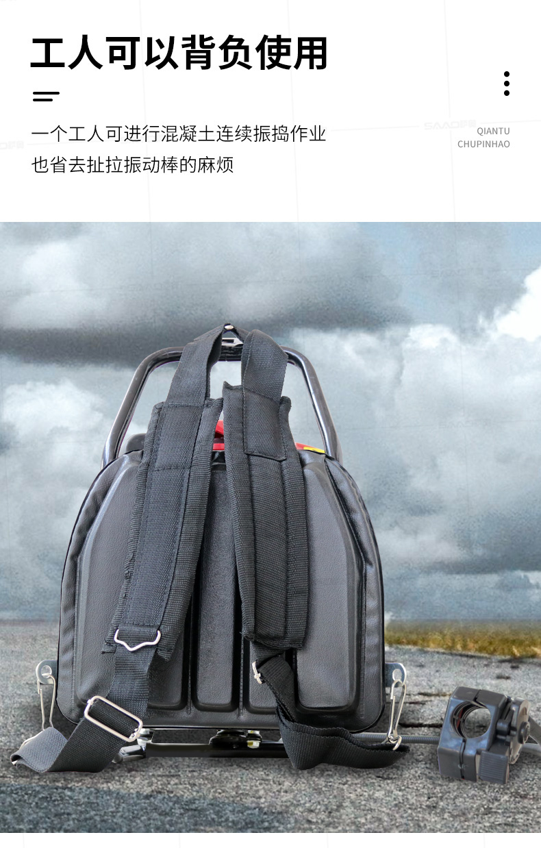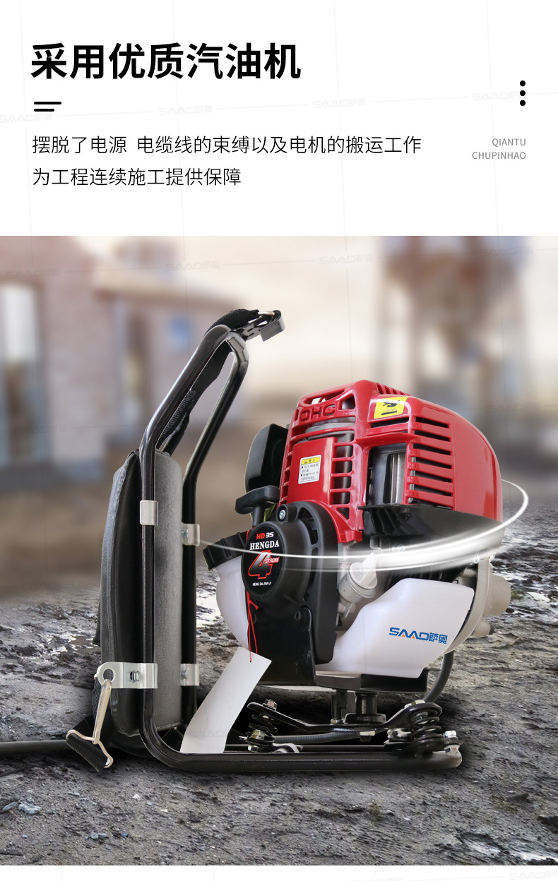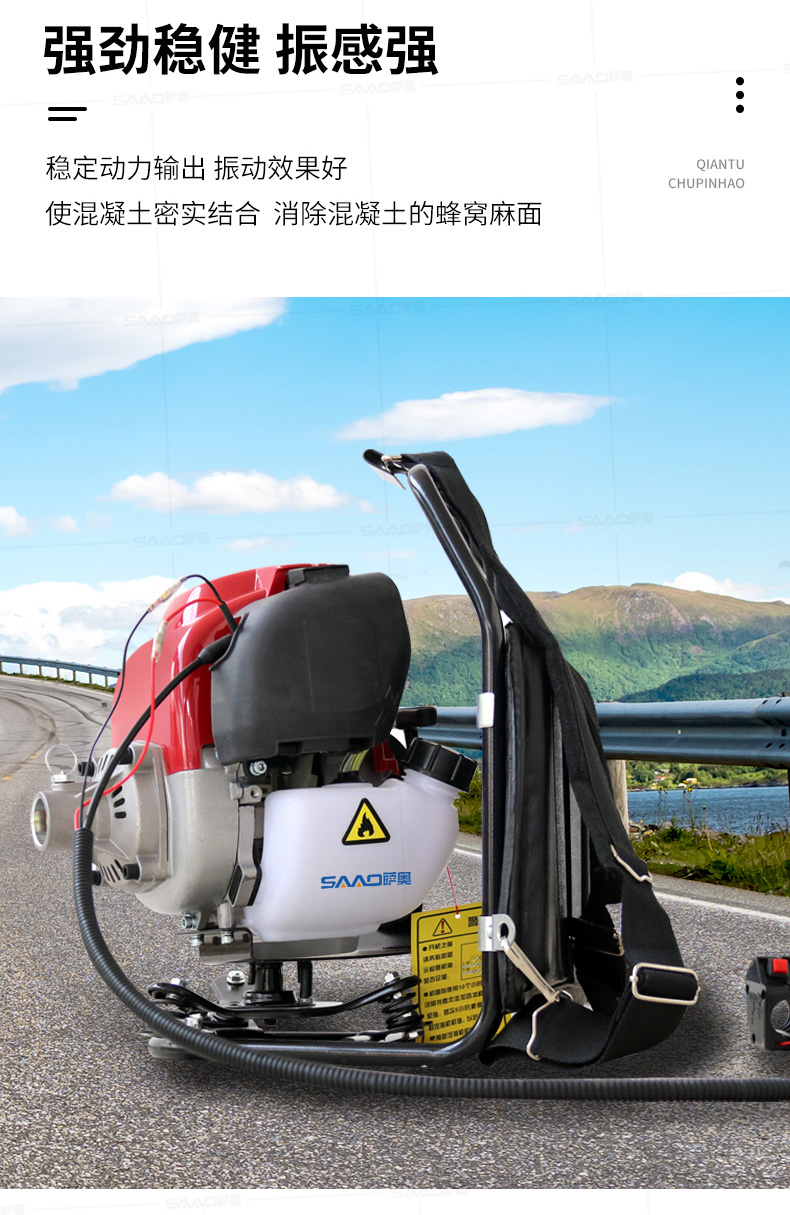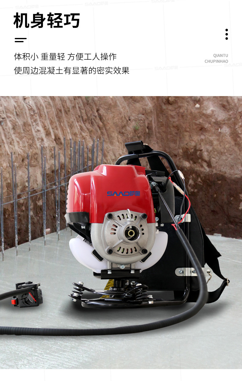 萨奥牌混凝土背负式汽油机振动棒是采用优质汽油机为动力直接驱动,是广泛适用于道路、桥梁、隧道、楼层基础和各种混凝土梁、柱及预制构件现场浇注施工的重要工具,是偏远无电