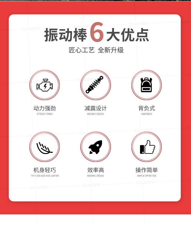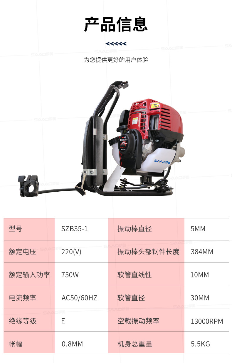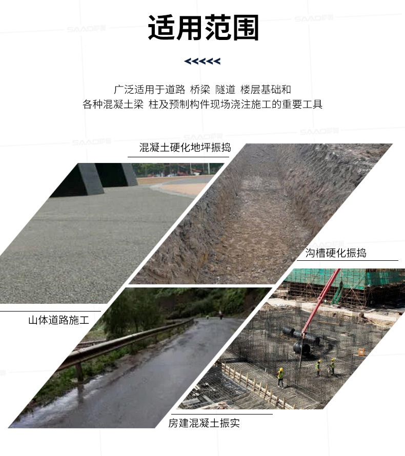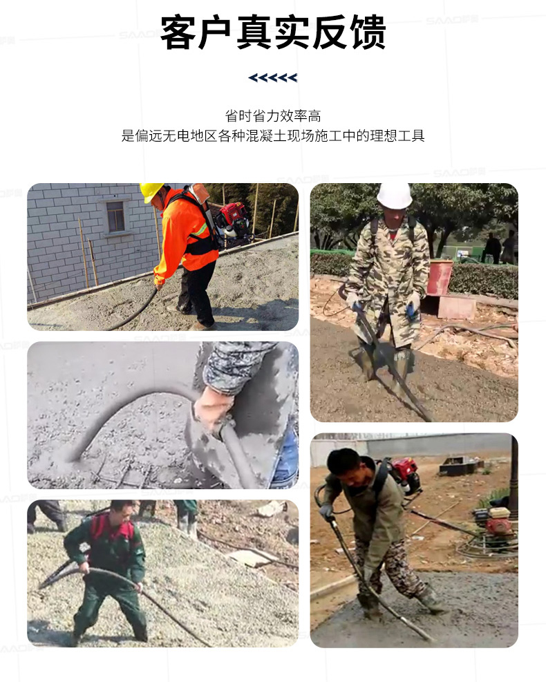 萨奥牌混凝土背负式汽油机振动棒是采用优质汽油机为动力直接驱动,是广泛适用于道路、桥梁、隧道、楼层基础和各种混凝土梁、柱及预制构件现场浇注施工的重要工具,是偏远无电