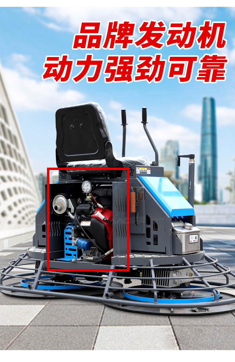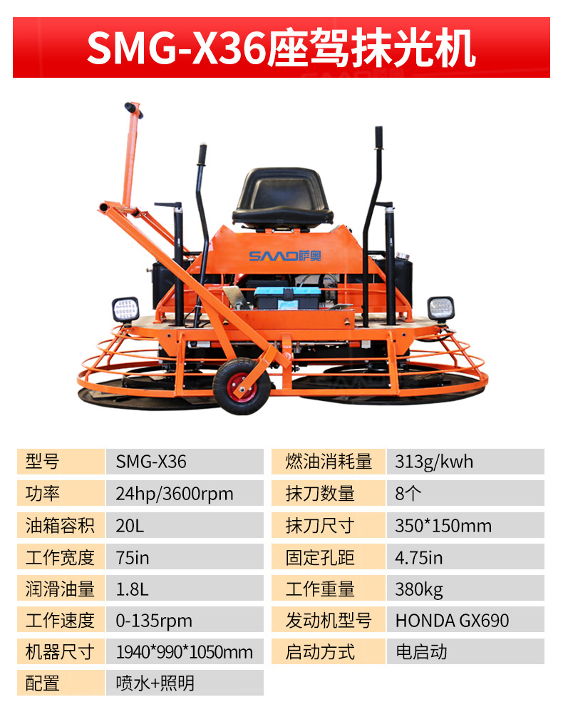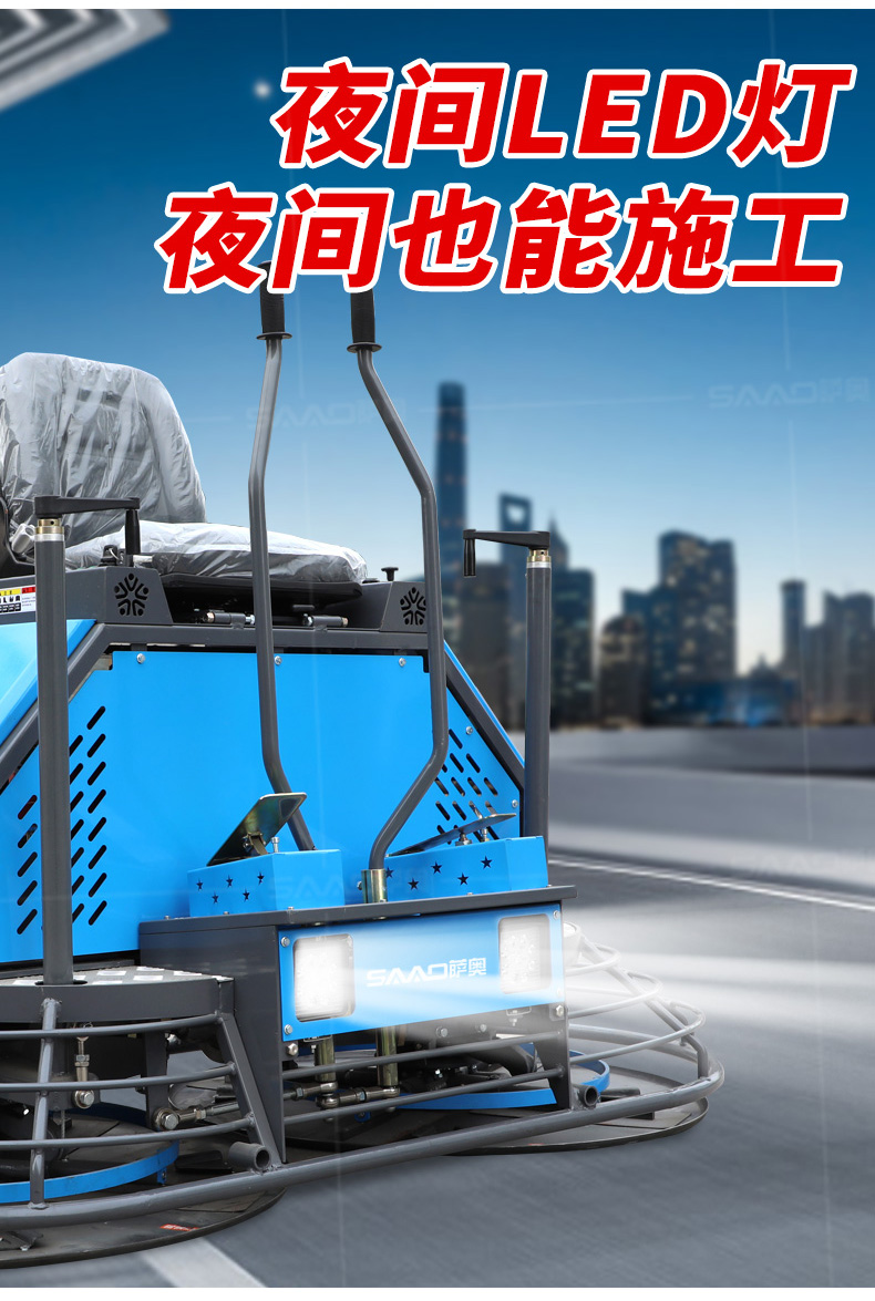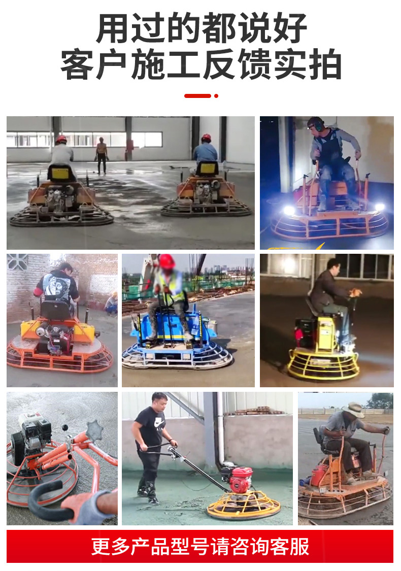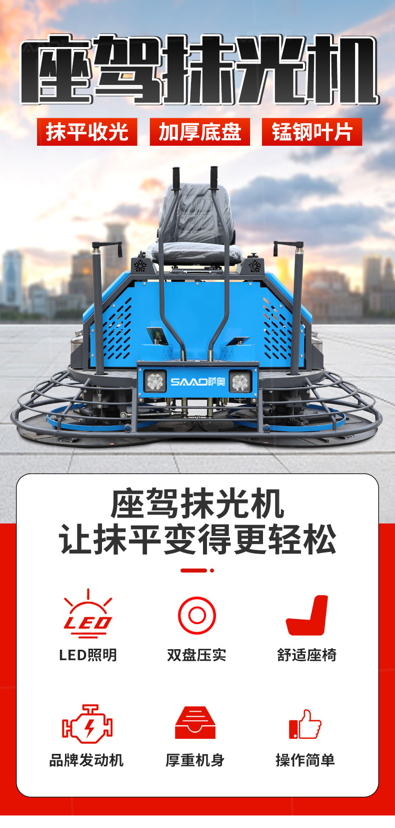 座驾式抹光机用于混凝土地面的提浆、压实、抹平、抹光,座驾式操作大大降低了操作者劳动强度,提高了作业效率。