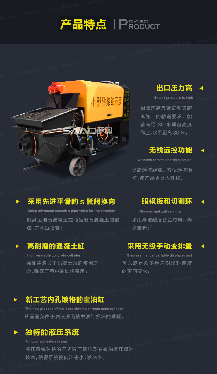 二次构造柱泵特点就是体积小,质量轻,配置高,性能稳定,使用灵活方便,而且泵送距离远,泵送混凝土至良好!是您室内二次结构浇筑混凝土的选择设备!