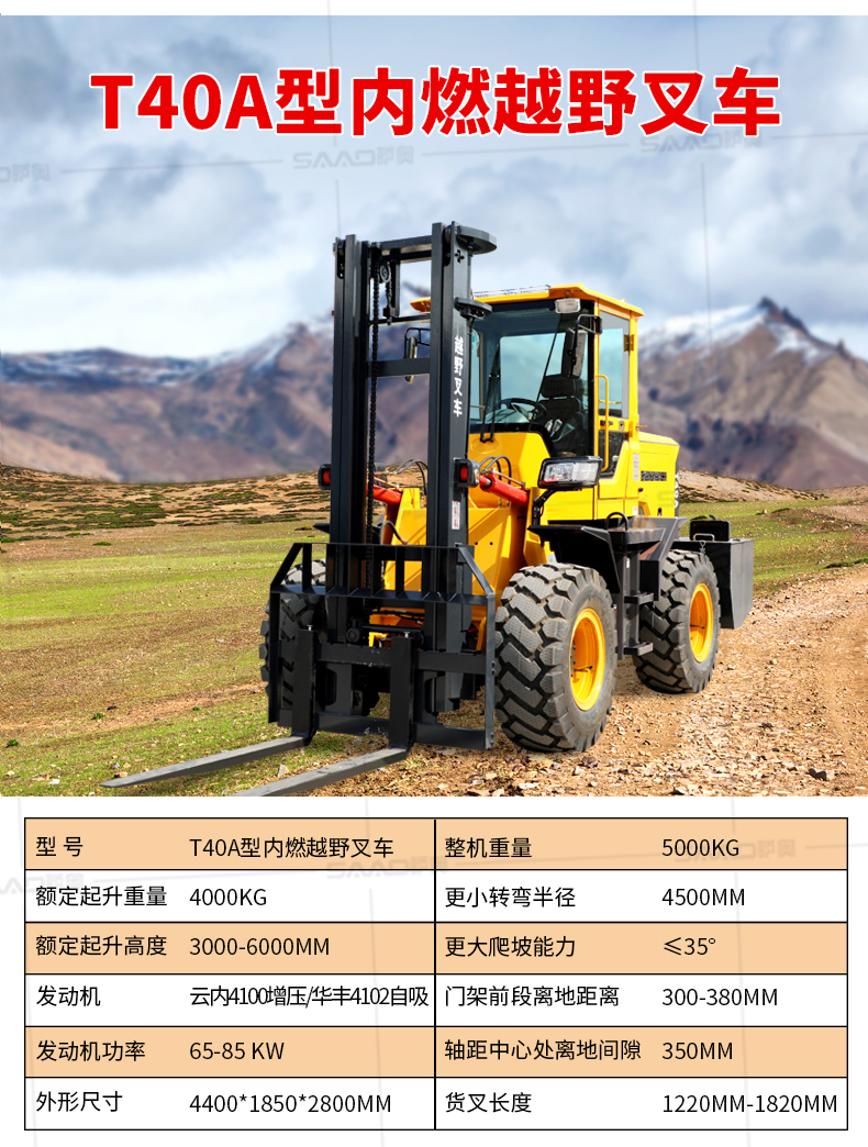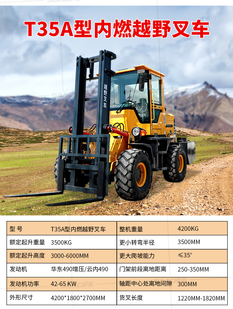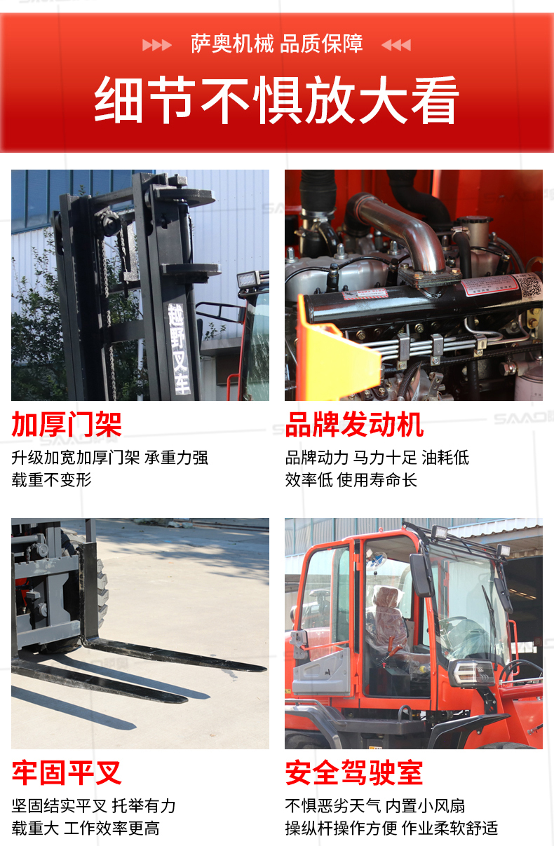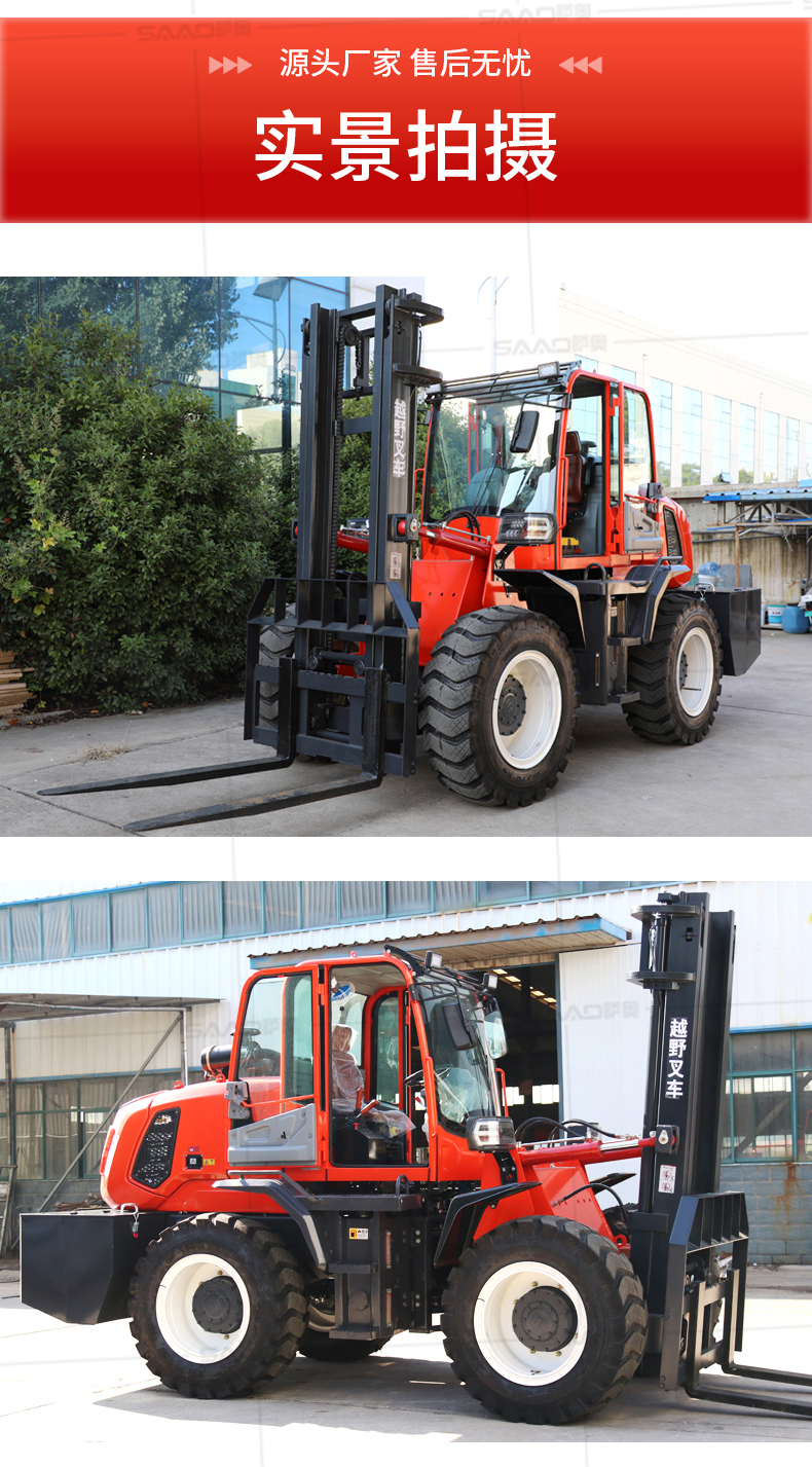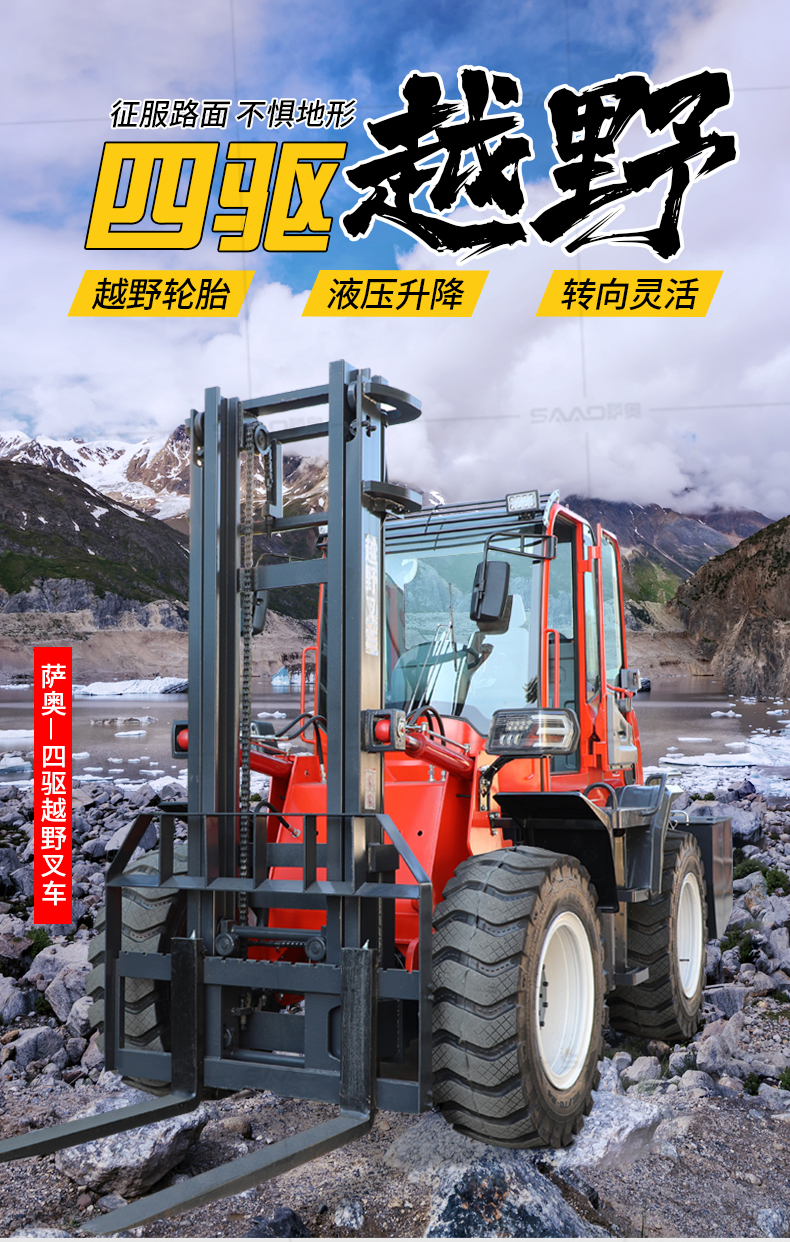 越野叉车可以在坡地和不平地面上进行货物装、卸、堆垛及搬运作业,具有良好的机动性、越野性可靠性。其功能多样,可搭配侧移器、调距叉、旋转器、软包夹、推出器、侧翻叉、侧