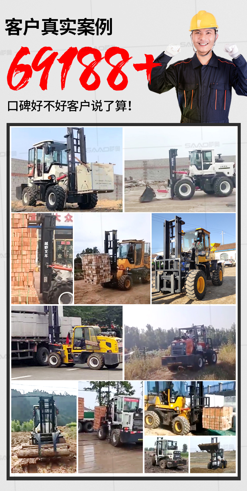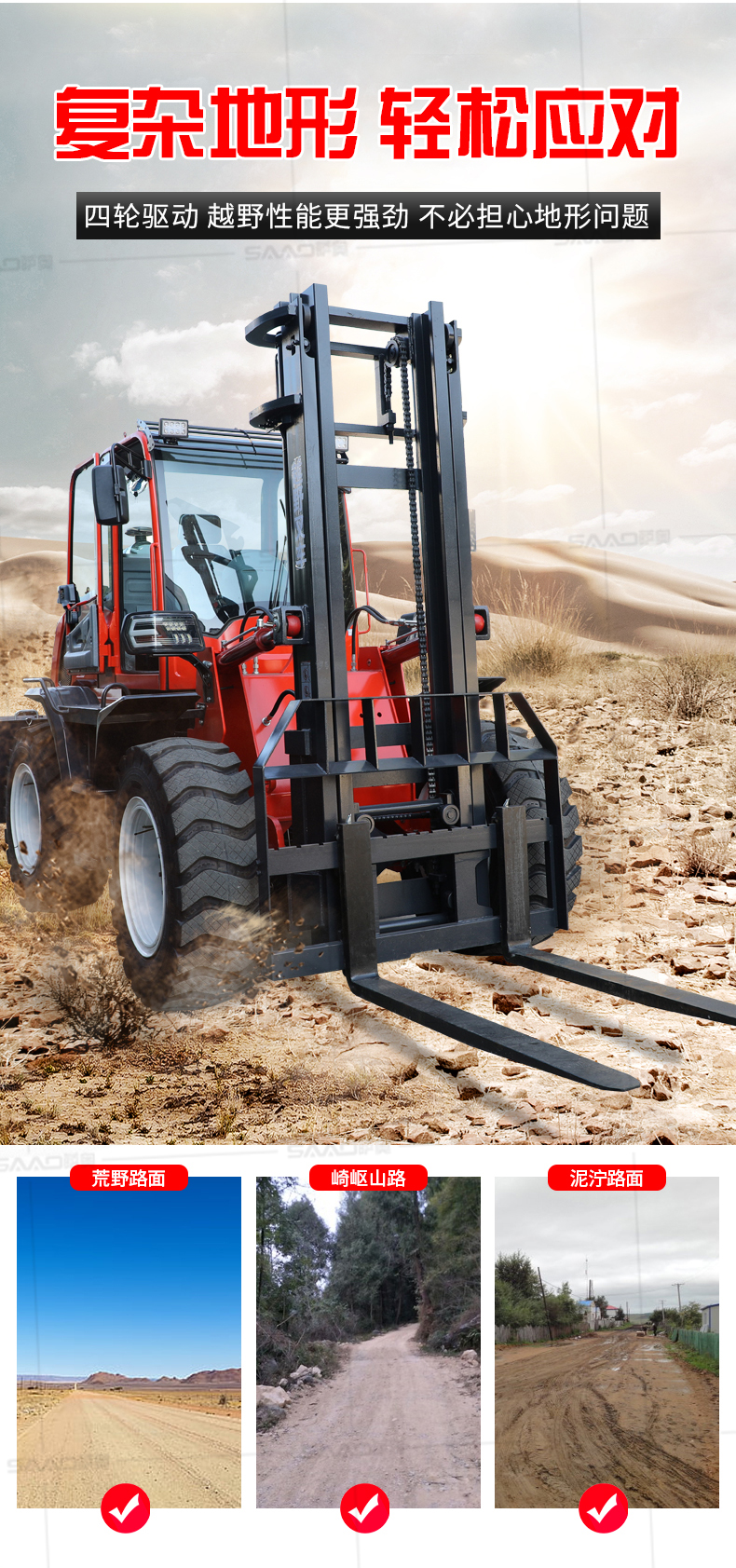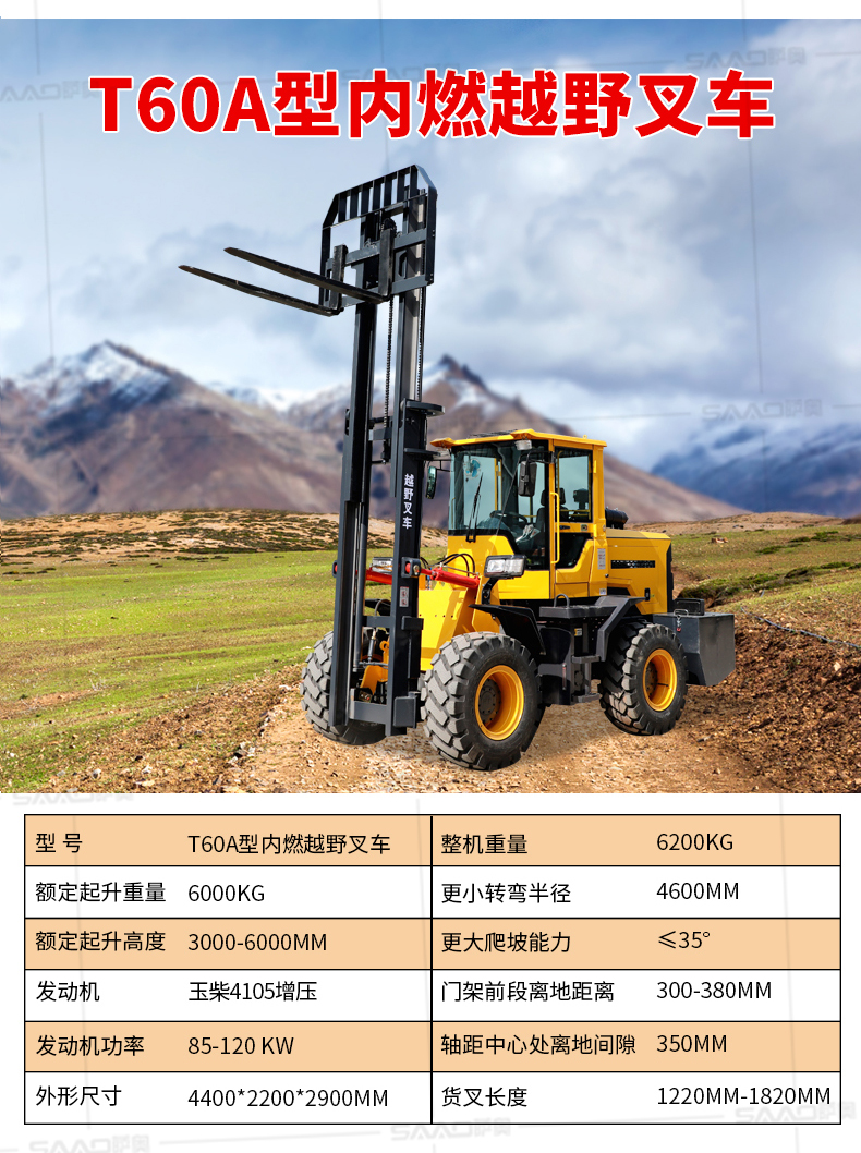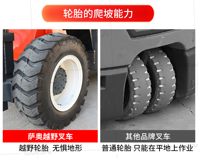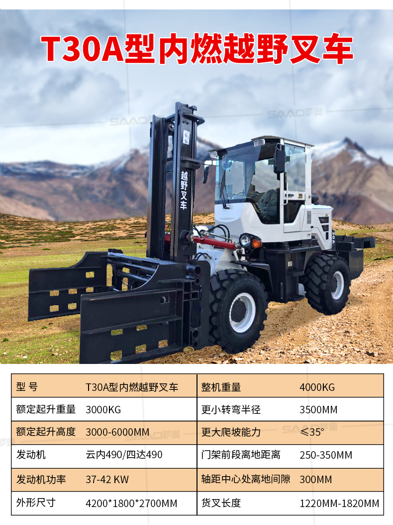 越野叉车可以在坡地和不平地面上进行货物装、卸、堆垛及搬运作业,具有良好的机动性、越野性可靠性。其功能多样,可搭配侧移器、调距叉、旋转器、软包夹、推出器、侧翻叉、侧