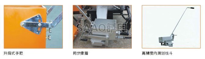 SAAO-320自走式热熔划线机采用德国最新的智能程序控制器和人性化控制面板,并配加进退自如的无级变速行走系统,大大提高了施工效率,是热熔标线施工的关键设备,同热熔釜配合使用,完成标线施工,该机采用特殊制造的高精密度铸铁划线斗,确保所划标线边齐,头齐,厚薄均匀,线型美观,落地刀能够适应不同情况的路面.