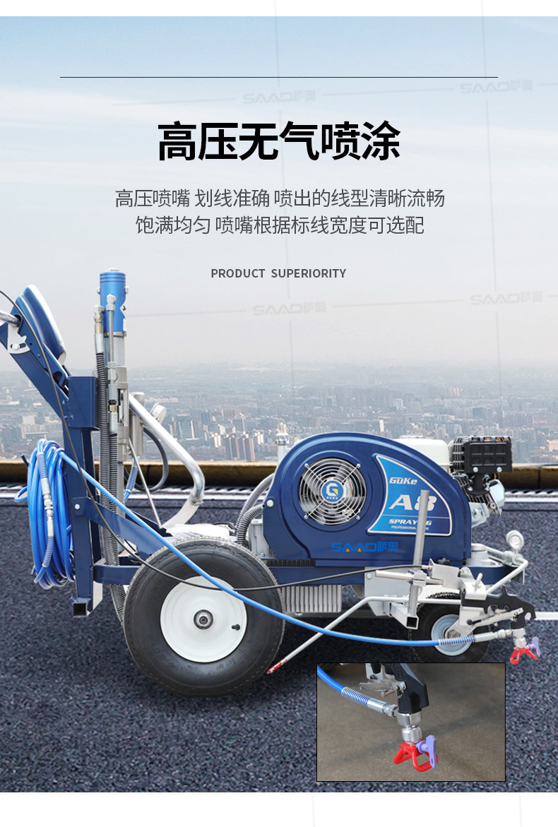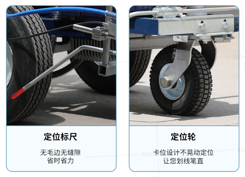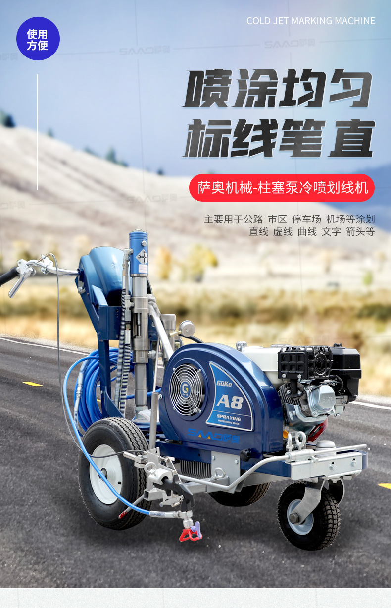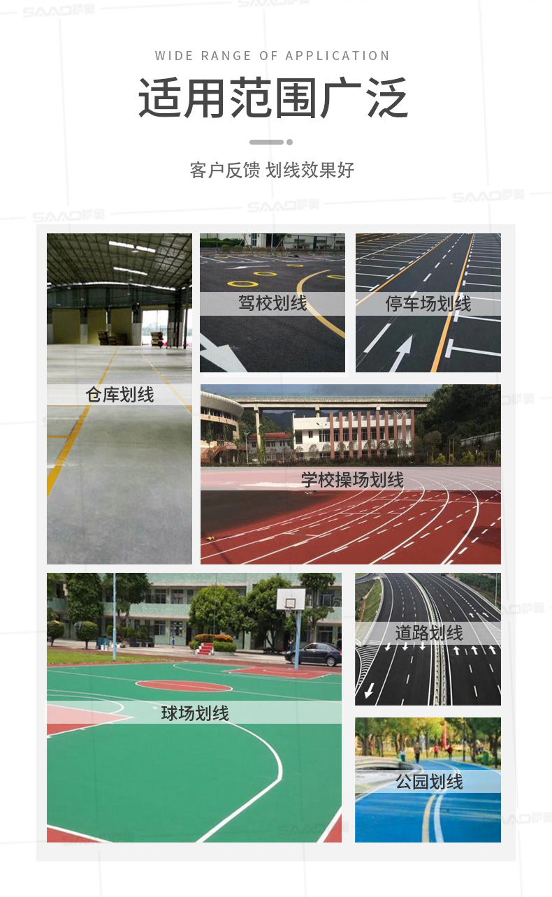 主要用于公路、市区、停车场、机场等涂划直线、虚线、曲线、文字、箭头等。具有划线效果好、速度快、效率高、适用范围广、使用方便等优点。