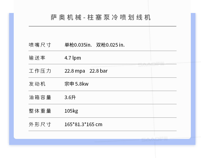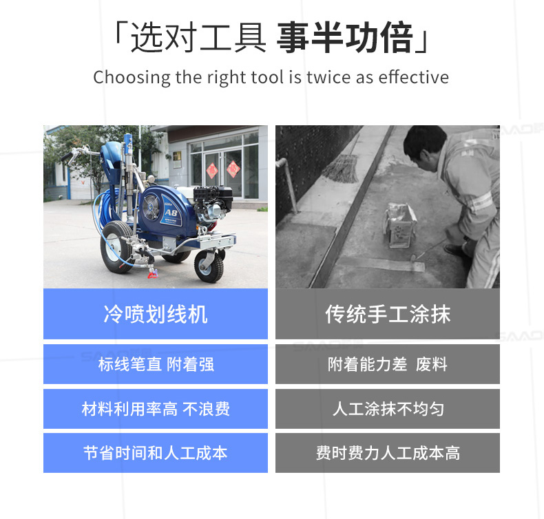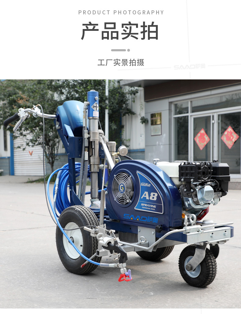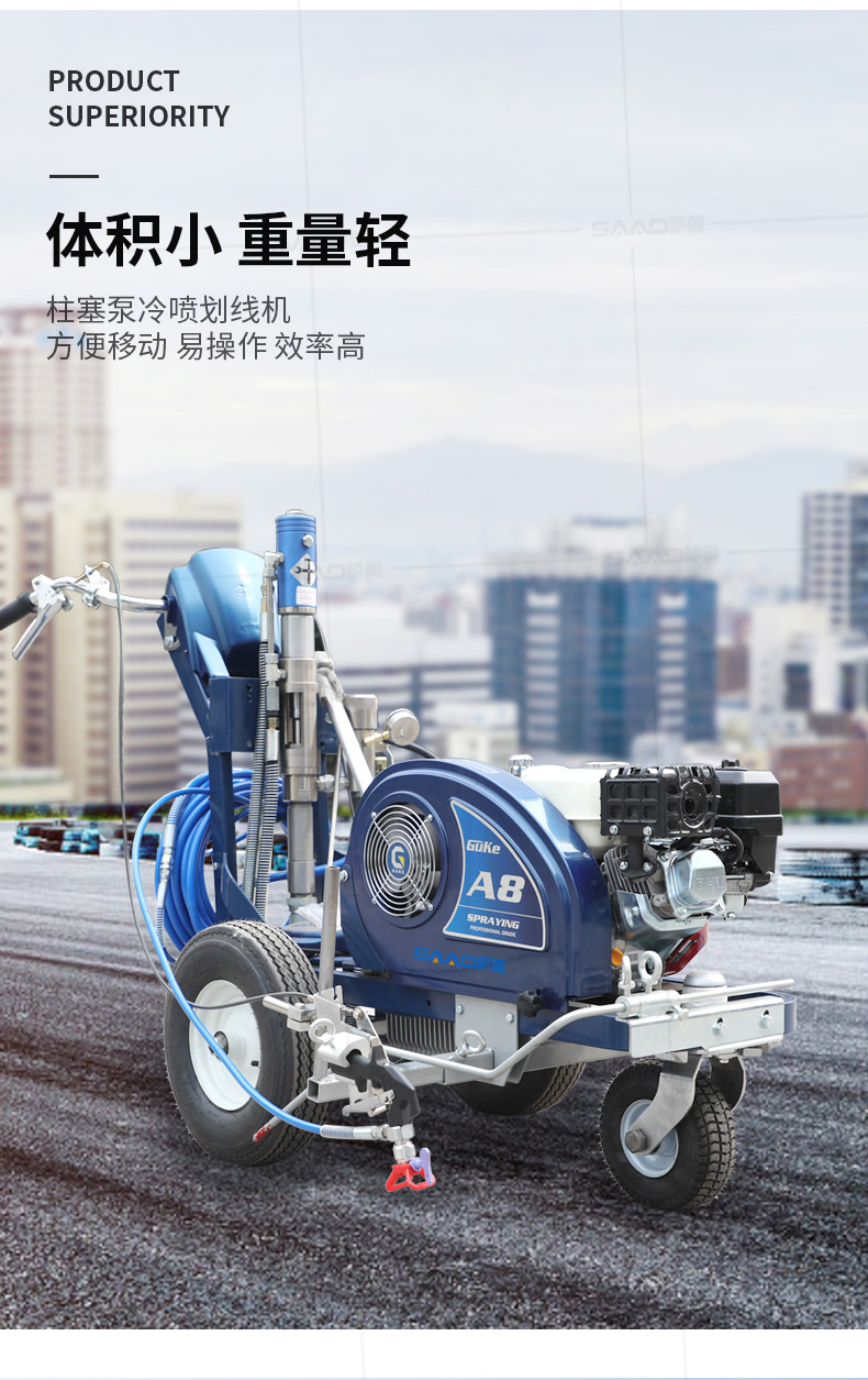 主要用于公路、市区、停车场、机场等涂划直线、虚线、曲线、文字、箭头等。具有划线效果好、速度快、效率高、适用范围广、使用方便等优点。