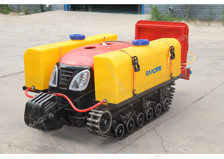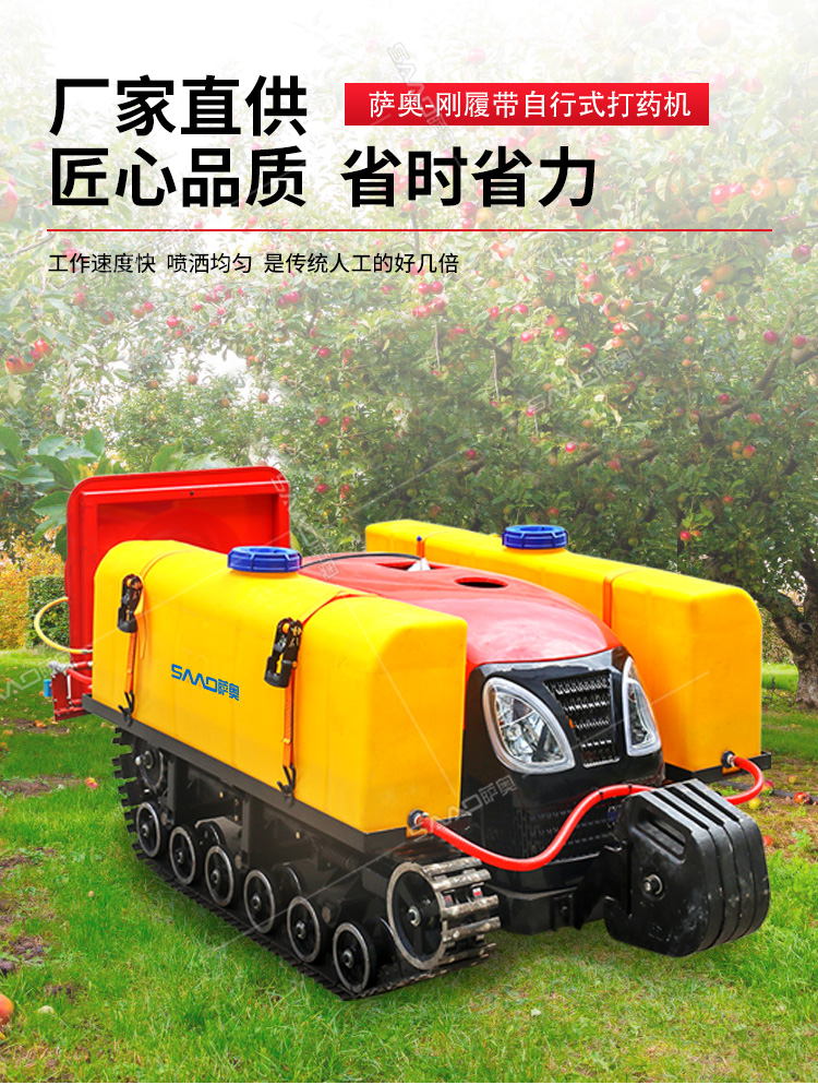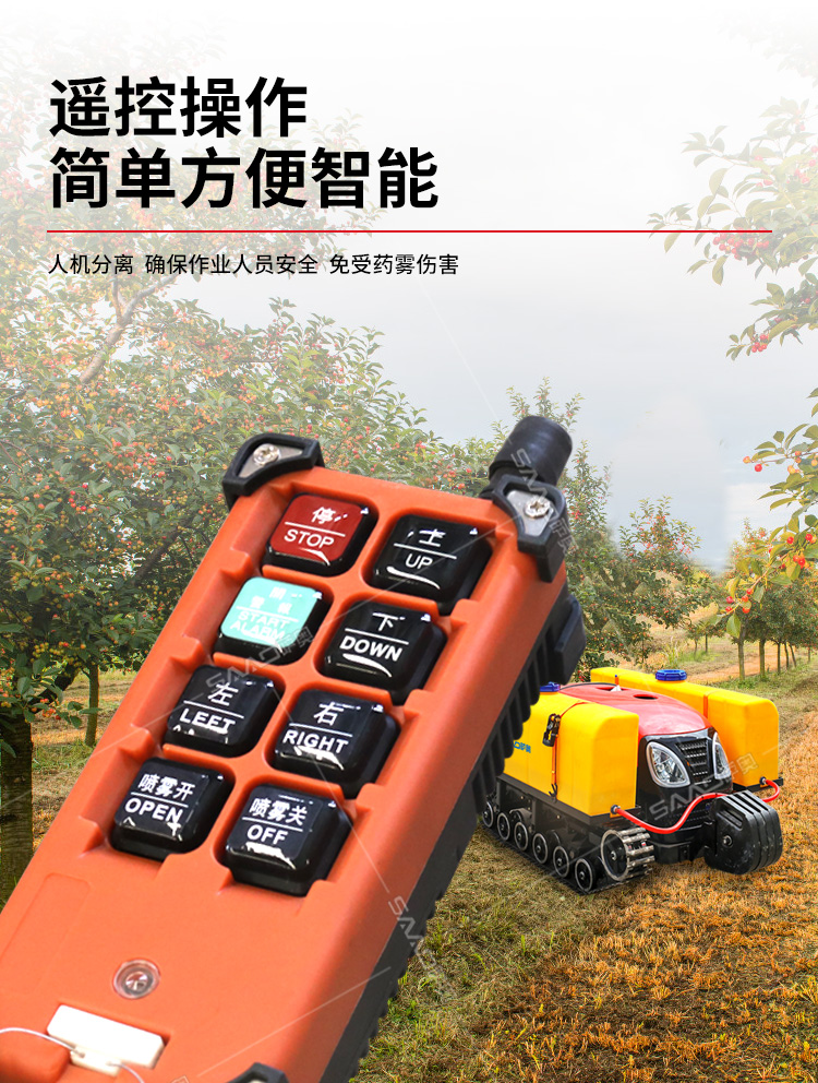 28马力钢履带自行式打药机,风送式喷雾机,雾化好,喷射距离远;遥控操作,人机分离,确保作业人员安全,免受药雾伤害。
