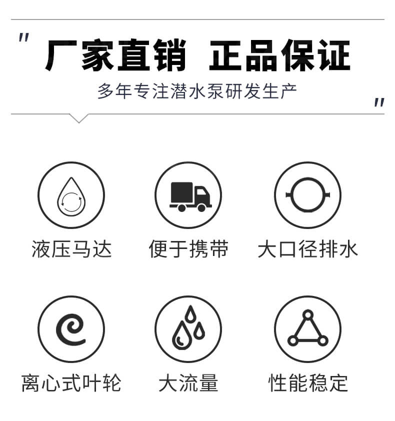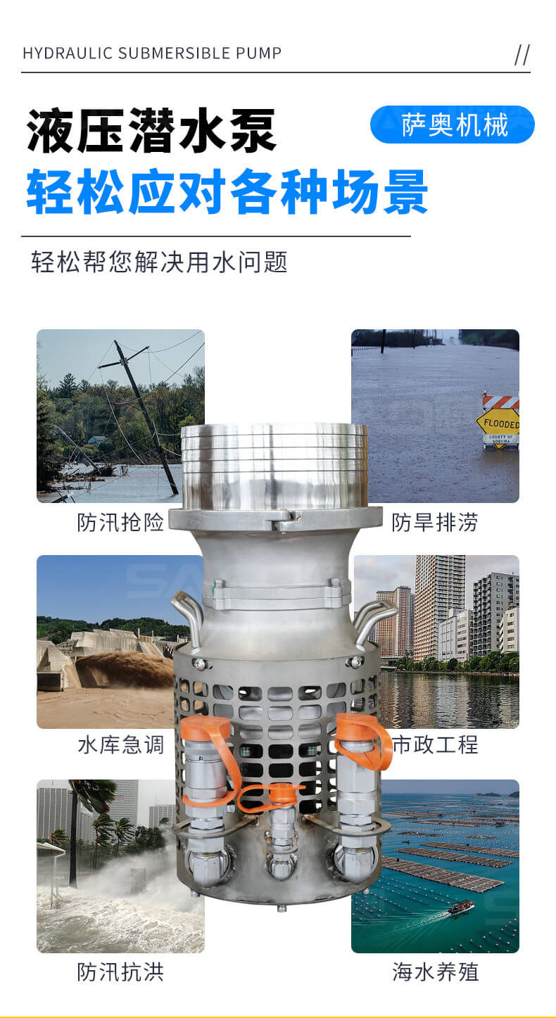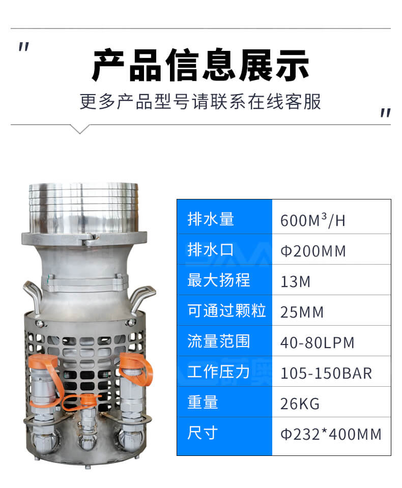 液压潜水泵重量轻,适用苛刻环境,耐磨件少,几乎不用维护保养,无需复杂操作培训,可与挖掘机、装载机等液压动力源连接使用。