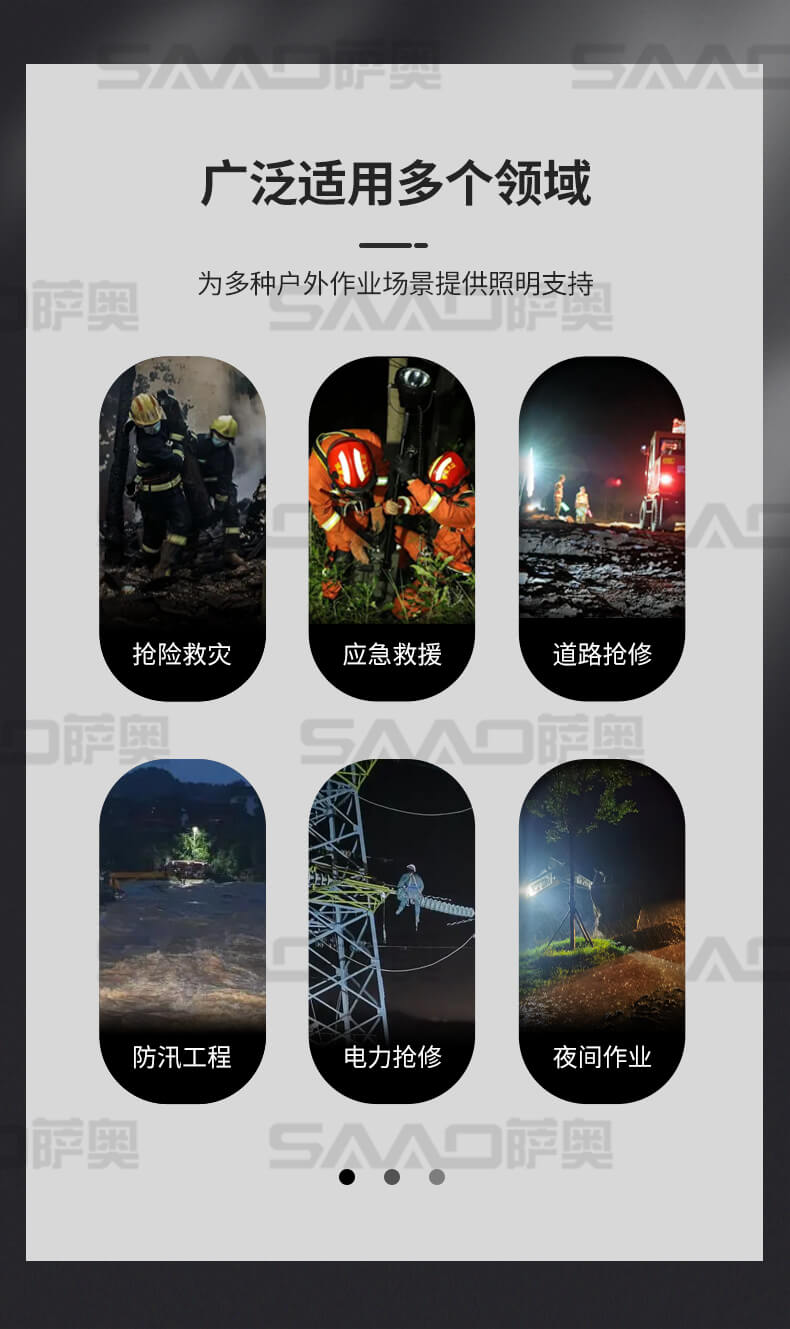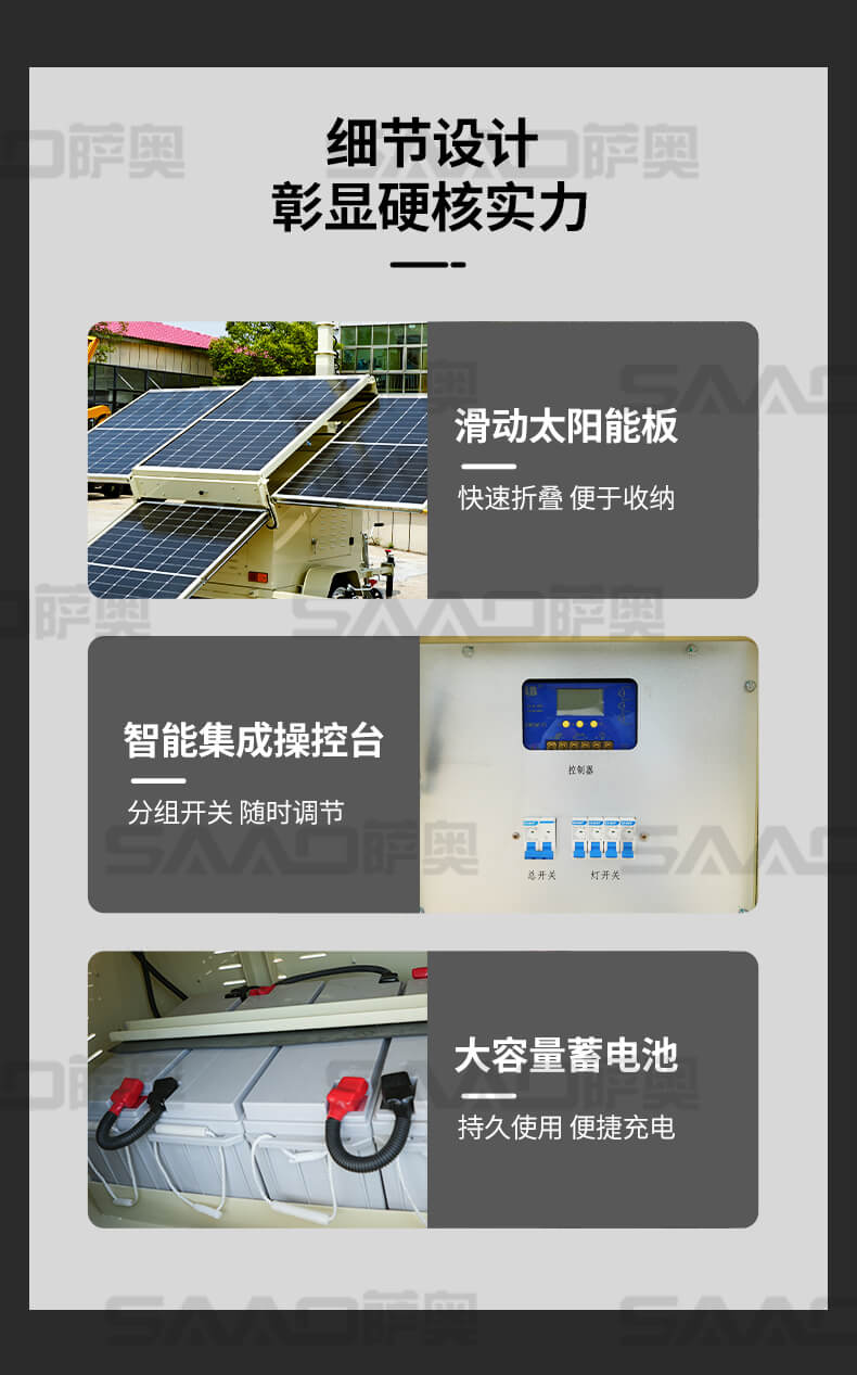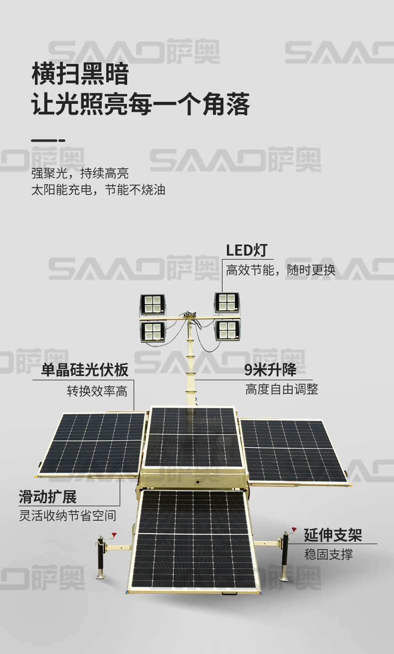 太阳能移动照明灯车适用于铁路、电力、公安、消防、露天采矿等各种大型施工作业、事故抢修、抢险救灾等工作现场对大面积高亮度照明的需要。