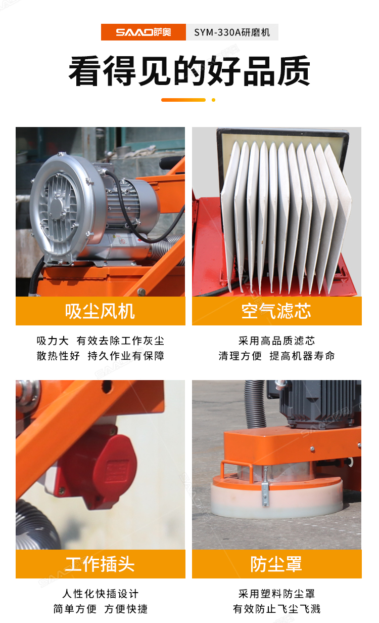 SYM-330手推式无尘地面研磨机,是集研磨和吸尘为一体的先进的路面机器,边打磨边吸尘,为我们提供良好的无尘打磨环境。特别是在地面混凝土强度低的情况,如果配上砂纸磨片,也可以打磨环氧腻子层;同时对环氧腻子层的磨损小,提高环氧地面的平整度。