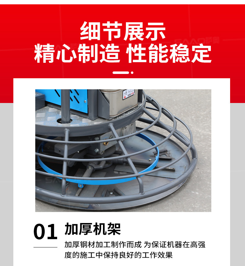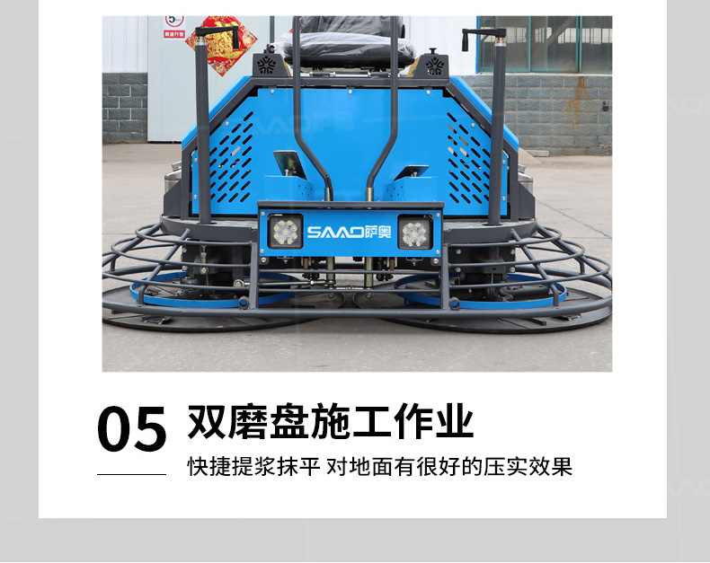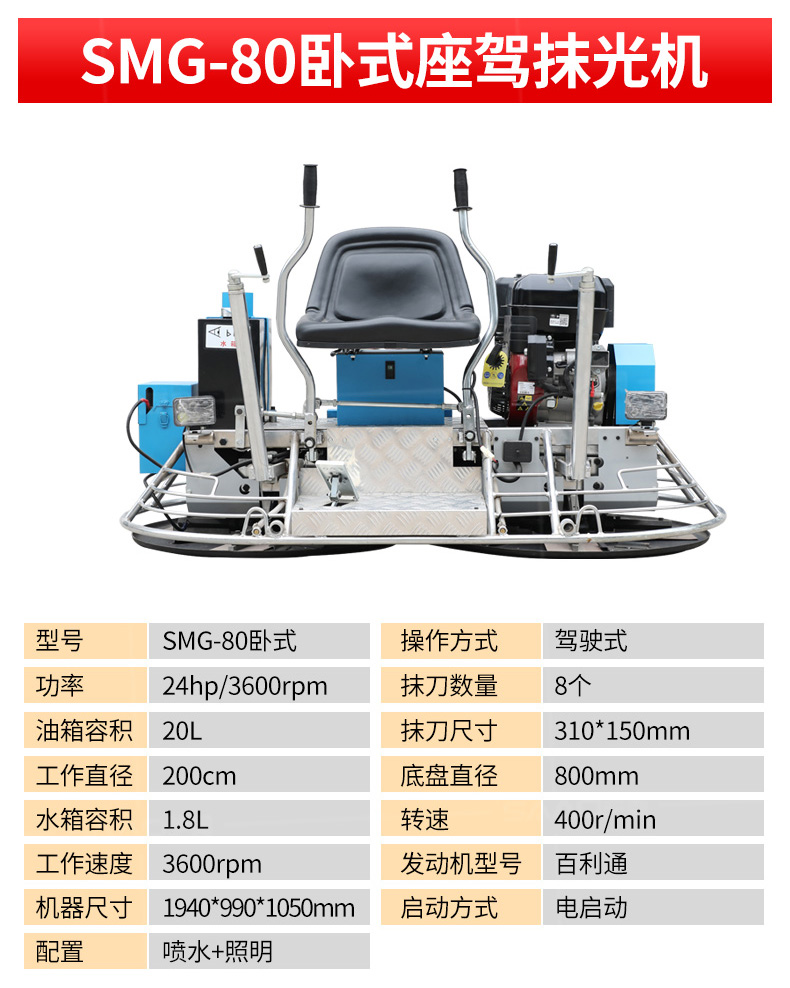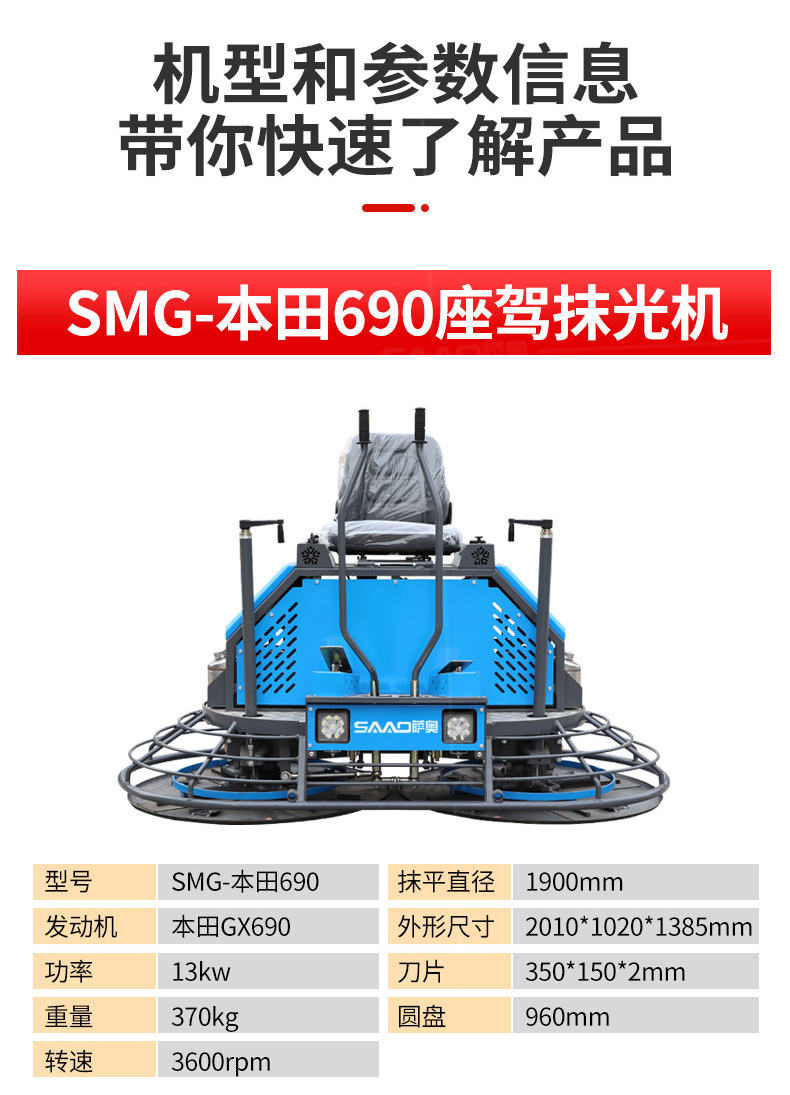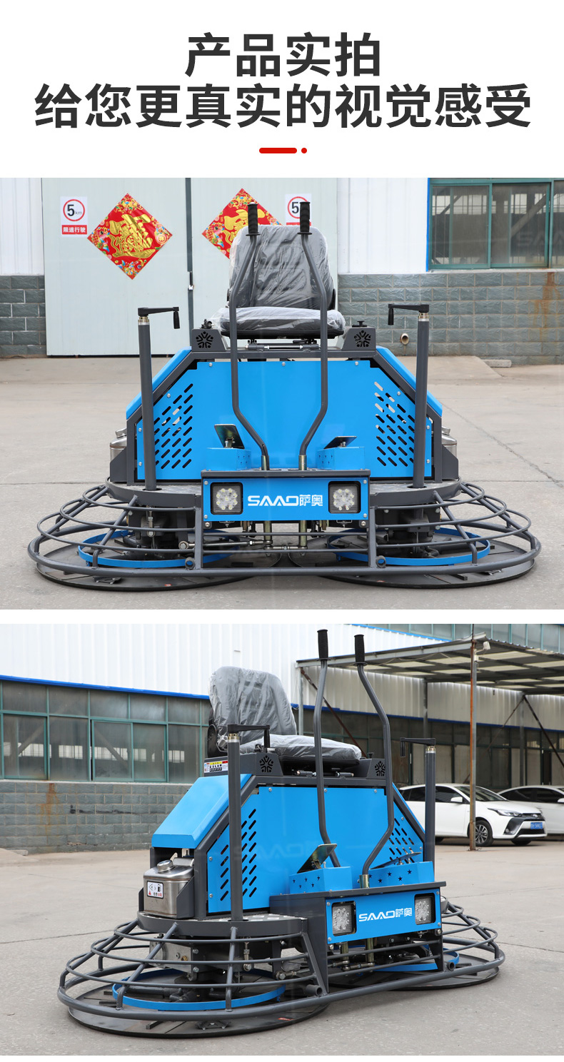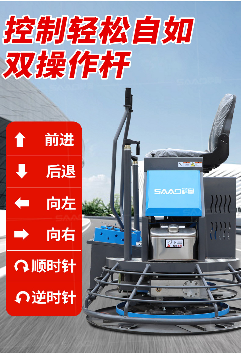 座驾式抹光机用于混凝土地面的提浆、压实、抹平、抹光,座驾式操作大大降低了操作者劳动强度,提高了作业效率。