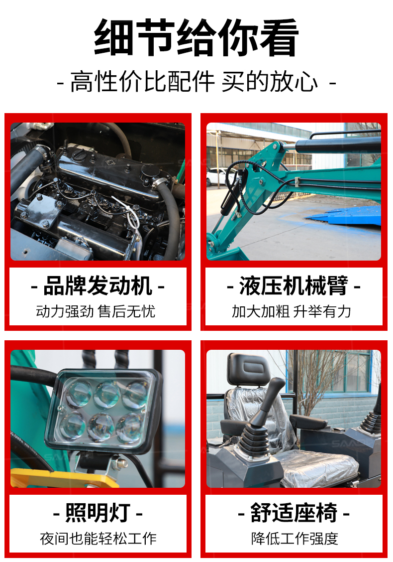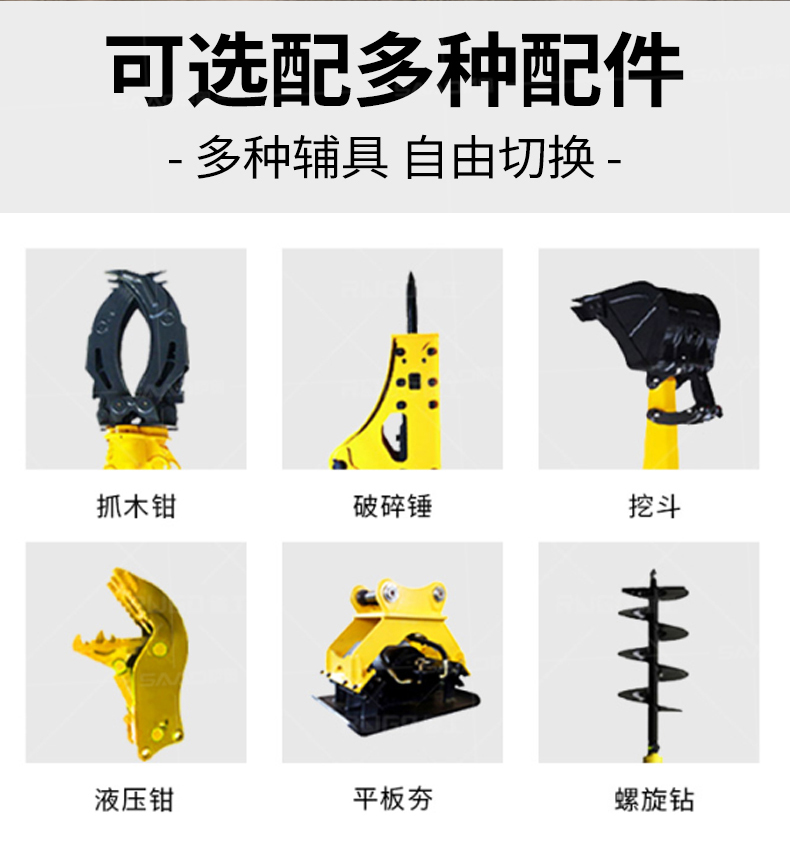 小型挖掘机可选配多种配件-多种辅具自由切换。