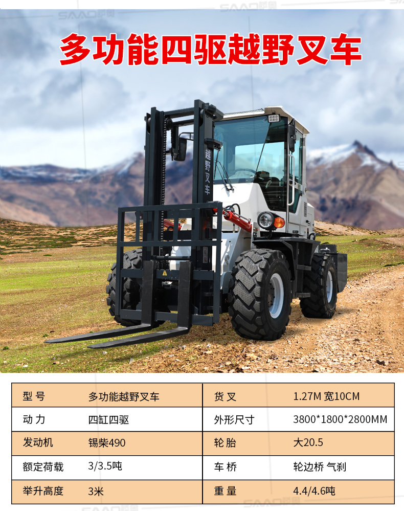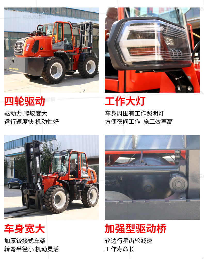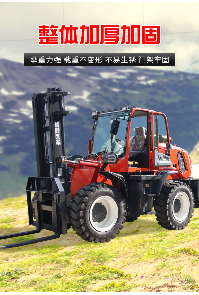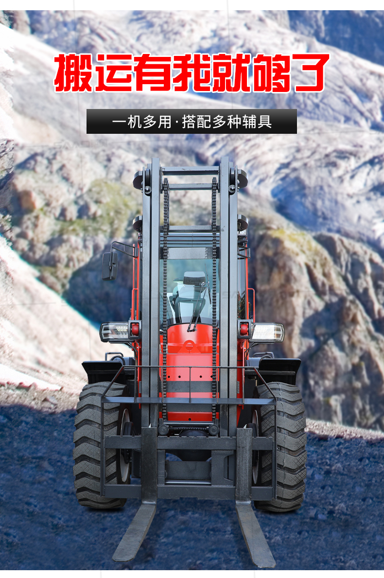 越野叉车可以在坡地和不平地面上进行货物装、卸、堆垛及搬运作业,具有良好的机动性、越野性可靠性。其功能多样,可搭配侧移器、调距叉、旋转器、软包夹、推出器、侧翻叉、侧