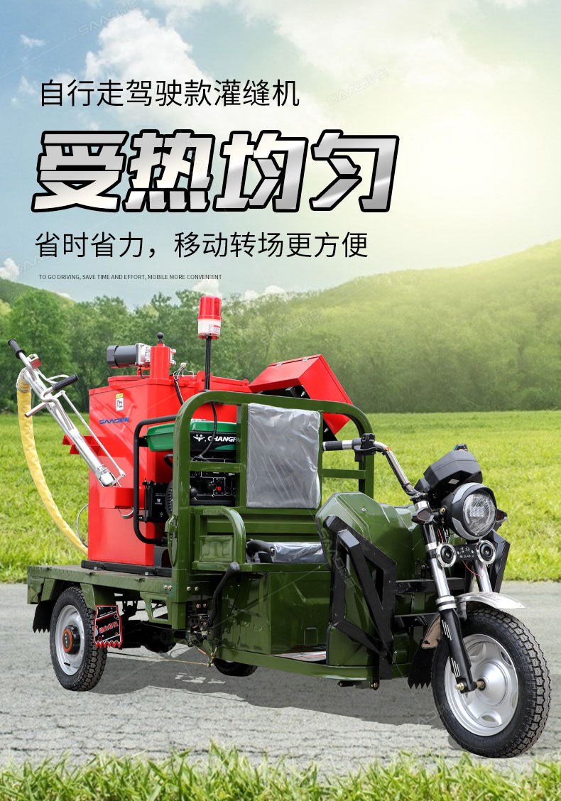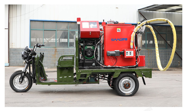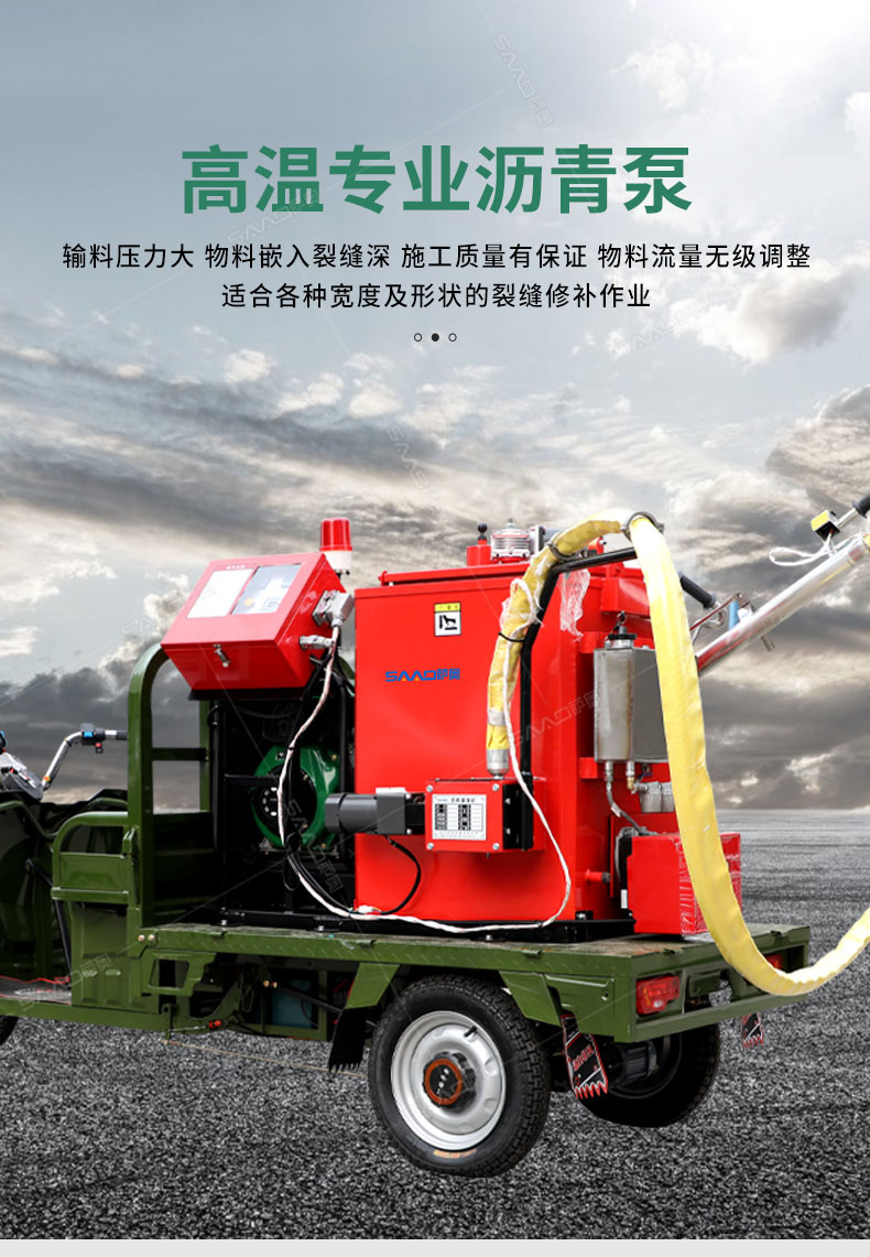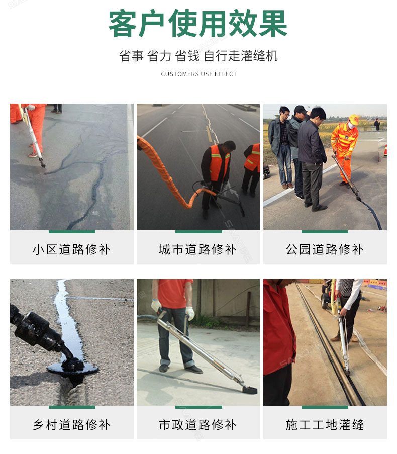 汽油灌缝机主要有手推式和自行式手持灌缝管操作,采用进口柴油燃烧器加热。在工作时首先在料箱内加入沥青或灌缝胶,启动发电机供电,依次间断打开导热油泵开关,燃烧器开关,出料管加热开关;调整自动温控系统与材料的温度相同,通过柴油燃烧器自动加热熔料箱内导热油开始升温(拖式为强制循环)使材料融化,温度是通过自控系统来控制。溶料时间大约30-40分钟左右。在材料融化、出料管温度达到后可以进行工作。手持灌缝管对正裂缝灌缝处理。沥青泵的出料流量可调。在工作过程中随时添加材料保证工作的连续性。