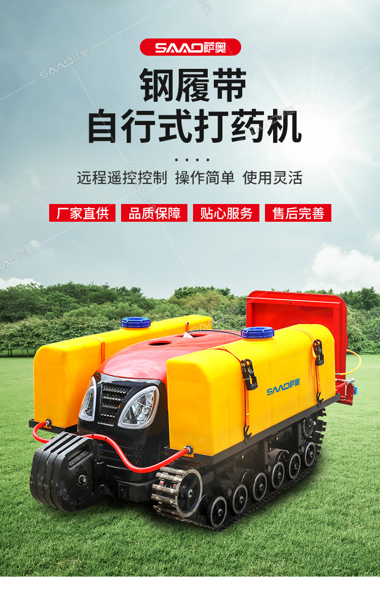 28马力钢履带自行式打药机,风送式喷雾机,雾化好,喷射距离远;遥控操作,人机分离,确保作业人员安全,免受药雾伤害。