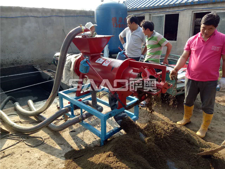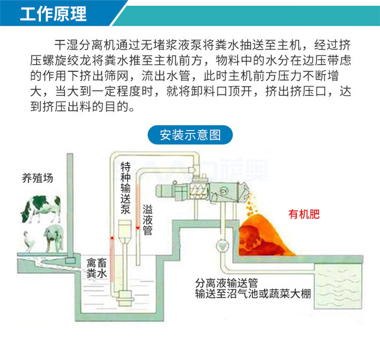 禽畜类粪便处理机能将鸡粪、牛粪、猪粪等禽畜粪便原粪水分离为液态有机肥和固态有机肥。液态有机肥可直接用于农作物利用吸收,固态有机肥可运到缺肥地区使用,也可起到改善土壤结构的作用,同时经过发酵可制成有机复合肥。用泥浆泵将原粪水送至机内,通过安置在筛网中的螺旋轴,挤压分离出固态物质,液体则通过筛网从出液口流出。