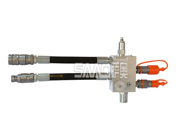液压分流阀用于连接液压工具和一挖掘机、装载机、工程车等承载设备的液压动力输出端。