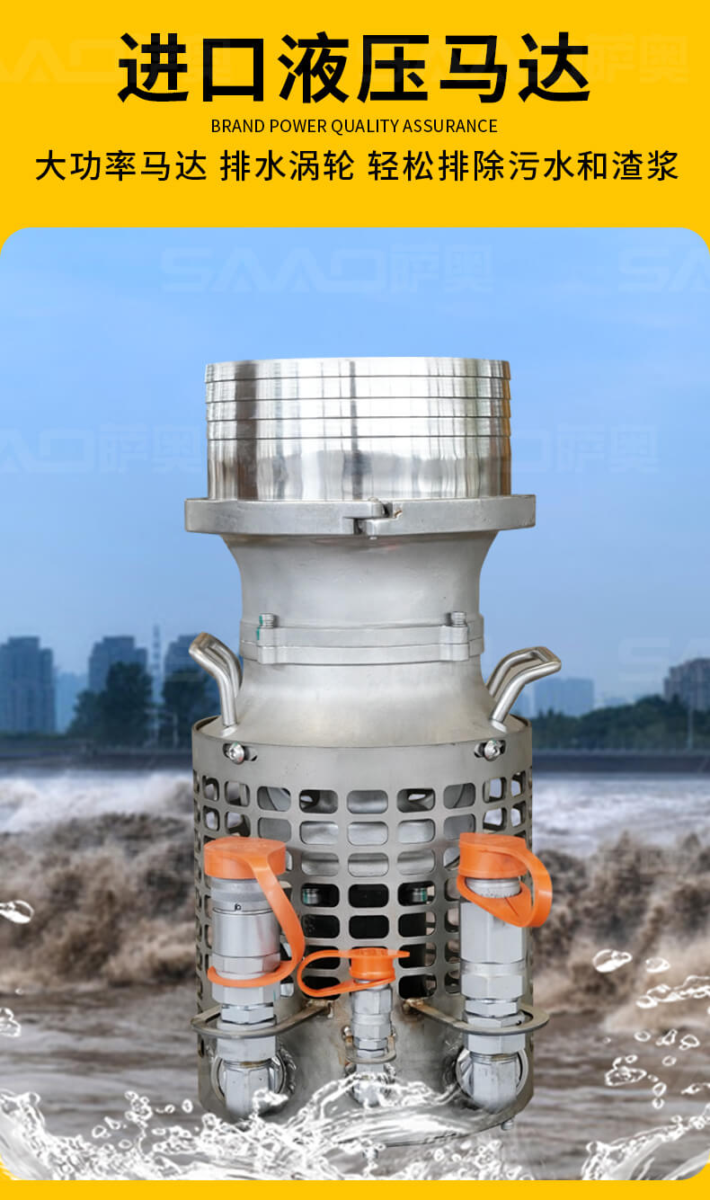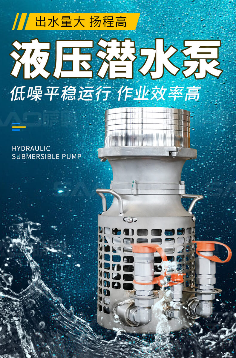液压潜水泵重量轻,适用苛刻环境,耐磨件少,几乎不用维护保养,无需复杂操作培训,可与挖掘机、装载机等液压动力源连接使用。